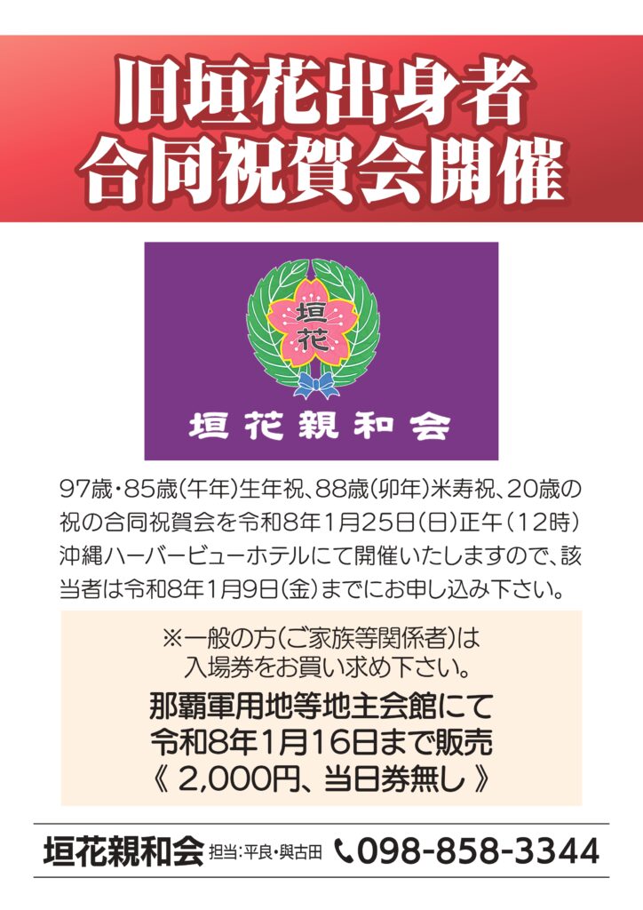 令和8年1月25日(日)正午(12時)より、旧垣花出身者合同祝賀会を行います。